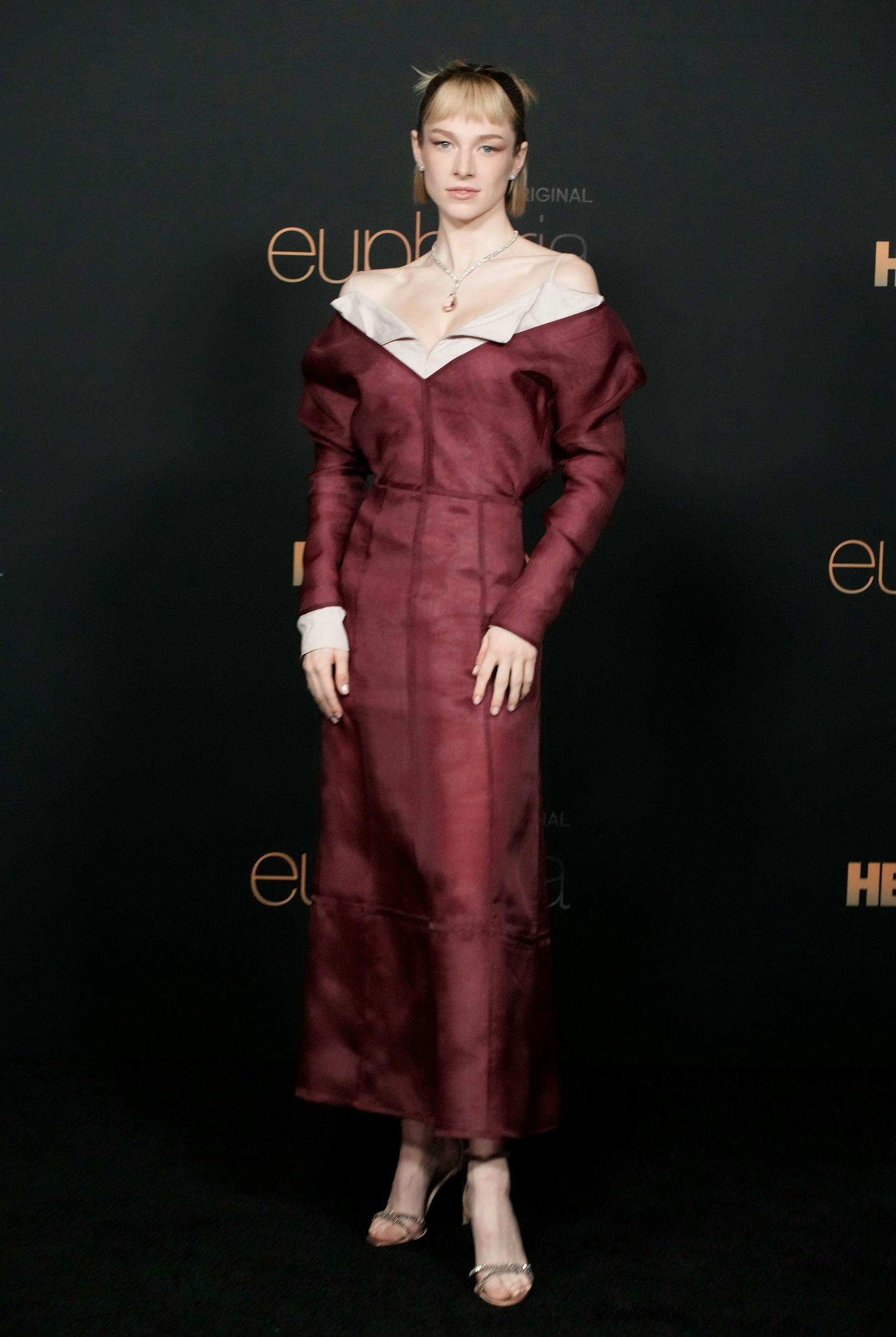 Hunter Schafer, meanwhile, showed up in a structured burgundy custom Prada dress with a nude undershirt and collar.